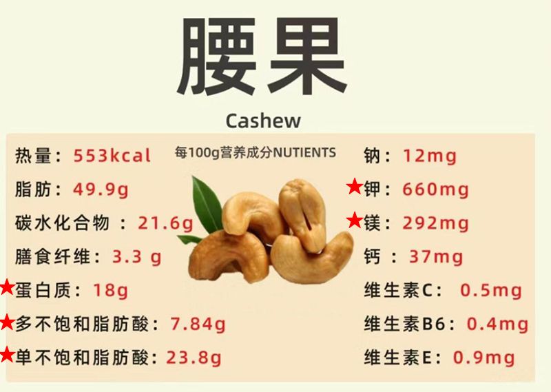 腰果含有豐富的不飽和脂肪酸、蛋白質、鉀及鎂 :