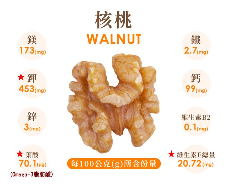 合桃含有豐富的Omega-3脂肪酸、鉀及維他命E :